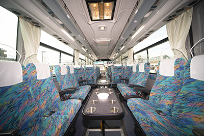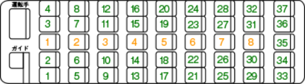 | バスカタログ | ミズノ興業はお客様のご要望にお応えするために様々なご用意をしております。バスの設備を映像や座席表でご案内させていただきます。ご不明な点がございましたらお問合せいただきますようお願い申し上げます。 1 大型バス【観光タイプ】 ・49席+補助11席 ・冷蔵庫・給湯器装備 ・座席にUSBジャック装備 ※装備の無い車輌もあり ・モニター・ビデオ ・採点カラオケ・ビンゴゲーム・CD・DVD ・サイドトランク(大きな荷物もラクラク収納) 映像でバスの設備を紹介 座席図(縦) 座席図(横) 座席図(縦) 巻込み防止センサー USBコネクタ装備(装備していない車両もあり) 2 大型バス【観光タイプ】 ・49席+補助11席 ・冷蔵庫・給湯器装備 ・モニター・ビデオ ・採点カラオケ・ビンゴゲーム・CD・DVD ・サイドトランク(大きな荷物もラクラク収納) 座席図(縦) 座席図(横) 座席図(縦) 3 大型バス【サロンタイプ】 ・45席+補助8席 ・冷蔵庫・給湯器装備 ・モニター・ビデオ ・採点カラオケ・ビンゴゲーム・CD・DVD ・サイドトランク(大きな荷物もラクラク収納) ・サロン 座席図(縦) 座席図(横) 座席図(縦) 4 中型バス【観光タイプ】 ・33席+補助4席 ・冷蔵庫・給湯器装備 ・モニター ・DVD・CD・ビンゴゲーム ・サイドトランク(大きなお荷物もラクラク収納) ・高速料金は大型と同じ特大区分になります。 座席図(縦) 座席図(横) 座席図(縦) 5 中型バス【サロンタイプ】 ・29席+補助4席 ・冷蔵庫・給湯器装備 ・高速料金は大型と同じ特大区分になります。 ・モニター ・DVD・CD・ビンゴゲーム ・サイドトランク(大きなお荷物もラクラク収納) ・サロン ・高速料金は大型と同じ特大区分になります。 座席図(縦) 座席図(横) 座席図(縦) 6 中型バス【送迎タイプ】 ・33席+補助7席 ・客席モニタ・冷蔵庫・サイドトランクの詳細の有無は別途ご確認ください。 ・高速料金は大型と同じ特大区分になります。 座席図(縦) 座席図(横) 座席図(縦) 7 中型バス【送迎タイプ】 ・33席+補助6席 ・客席モニタ・冷蔵庫・サイドトランクの詳細の有無は別途ご確認ください。 ・高速料金は大型と同じ特大区分になります。 座席図(縦) 座席図(横) 座席図(縦) 8 中型バス【送迎タイプ】 ・37席+補助8席 ・客席モニタ・冷蔵庫・サイドトランクの詳細の有無は別途ご確認ください。 ・高速料金は大型と同じ特大区分になります。 座席図(縦) 座席図(横) 座席図(縦) 9 中型バス【送迎タイプ】 ・37席+補助5席 ・客席モニタ・冷蔵庫・サイドトランクの詳細の有無は別途ご確認ください。 ・高速料金は大型と同じ特大区分になります。 座席図(縦) 座席図(横) 座席図(縦) 10 マイクロバス ・21席+補助5席 ・2番席有無あり 座席図(縦) 座席図(横) 座席図(縦)