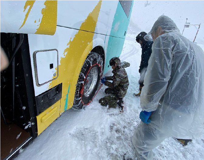 塩沢石打IC~スキー場駐車場までの峠道もかなり積雪が有り、先輩乗務員に指導されながら慎重にハンドルを操作していました。 駐車場では新雪が積り、スタッドレスタイヤとタイヤチェーンを装着してもハンドルが効かない怖さも、身をもって体験しました。今回の訓練を通してチェーンの早めの装着、雪道走行の注意点を意識して、お客様に安心・安全にご乗車頂けるよう運行させて頂きます。