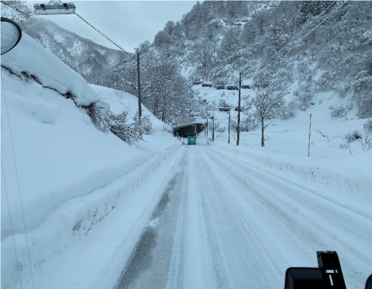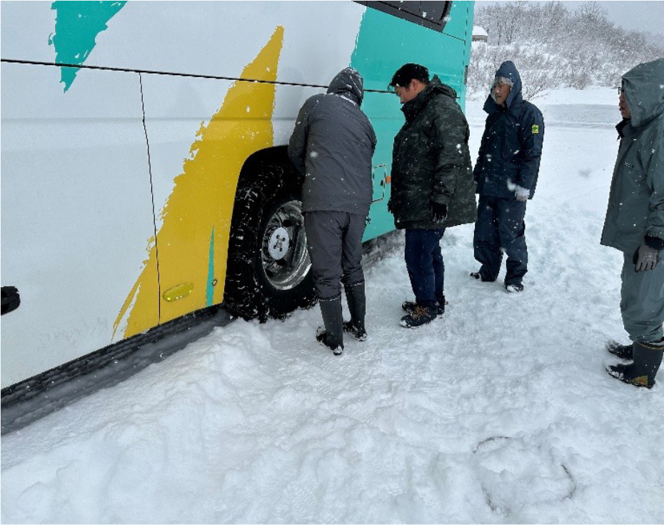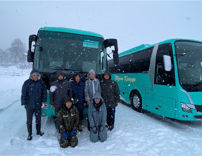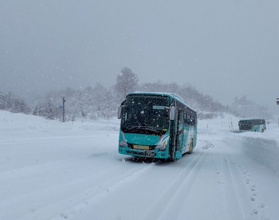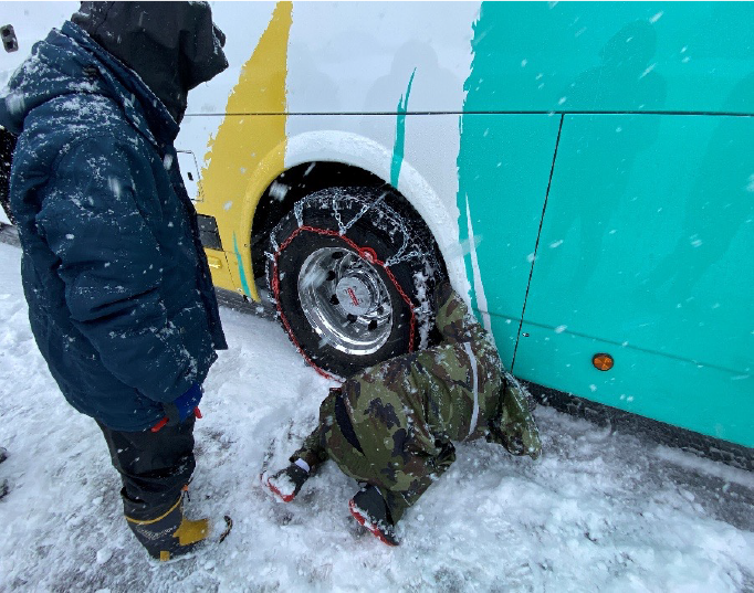 塩沢石打IC~スキー場駐車場までの峠道もかなり積雪が有り、先輩乗務員に指導されながら慎重にハンドルを操作していました。 駐車場では新雪が積り、スタッドレスタイヤとタイヤチェーンを装着してもハンドルが効かない怖さも、身をもって体験しました。今回の訓練を通してチェーンの早めの装着、雪道走行の注意点を意識して、お客様に安心・安全にご乗車頂けるよう運行させて頂きます。